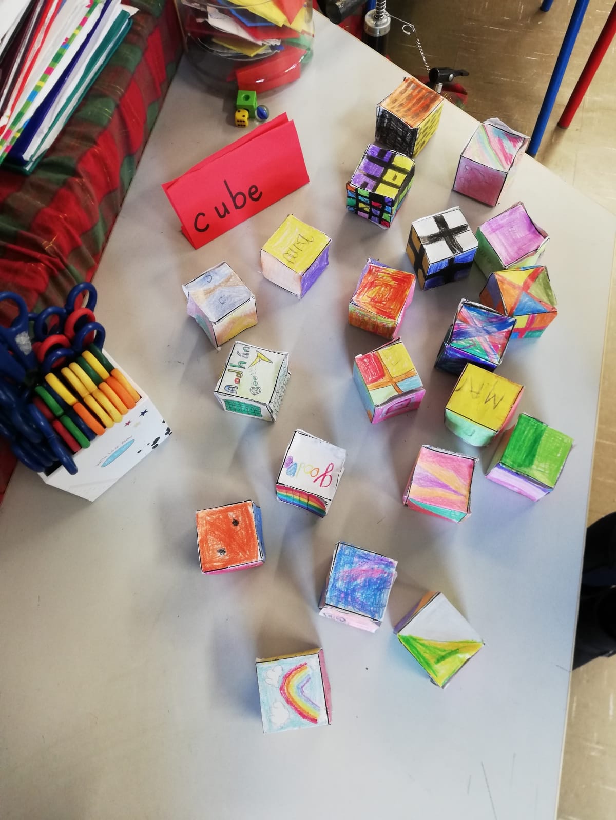 2nd class had great fun creating 3D shapes with toothpicks and marshmallows. They were also allowed to draw on the tables to classify the 3D shapes. They listed all the properties they could think of under each shape. Very clever of them!