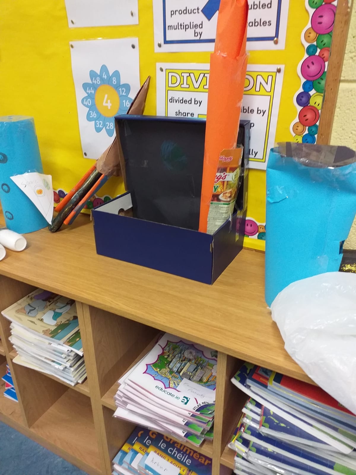 3rd Class had great fun making and testing their rockets. They tested different shapes and materials to see which ones responded the best.