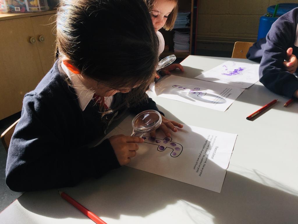 Junior infants examined their unique fingerprints when they were learning the letter ‘f’. They had fun using the magnifying glass to see their fingerprints up close.