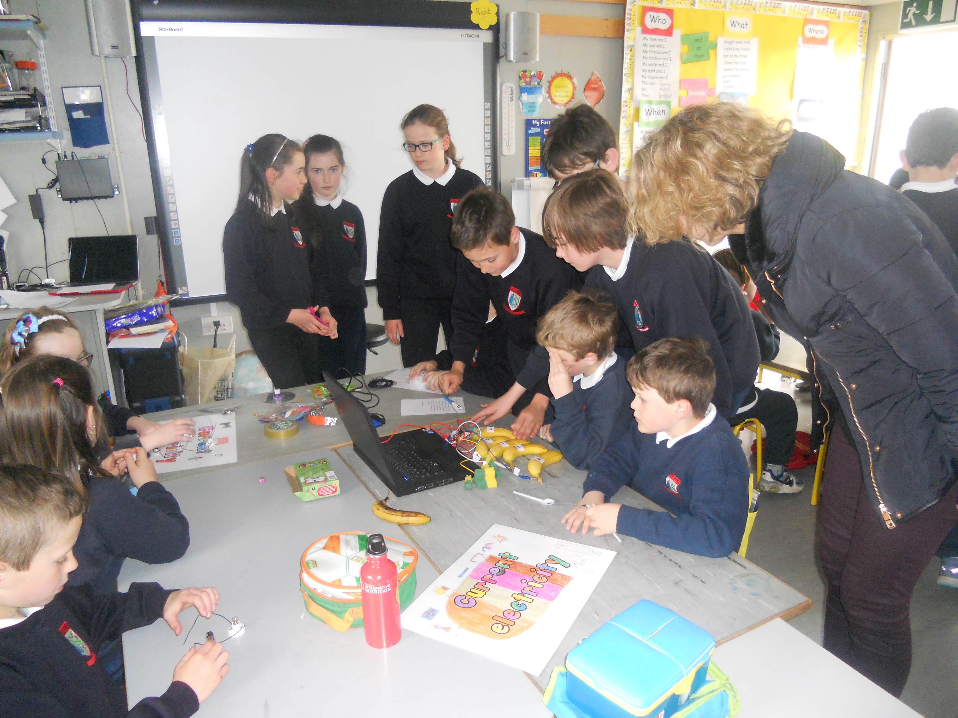 - Current electricity & conductivity – We used the makey makey and a computer to test conductivity of objects. We tested some plastic spoons, bananas, metal spoons and a rubber. We discovered that only the bananas and metal spoons were conductive.