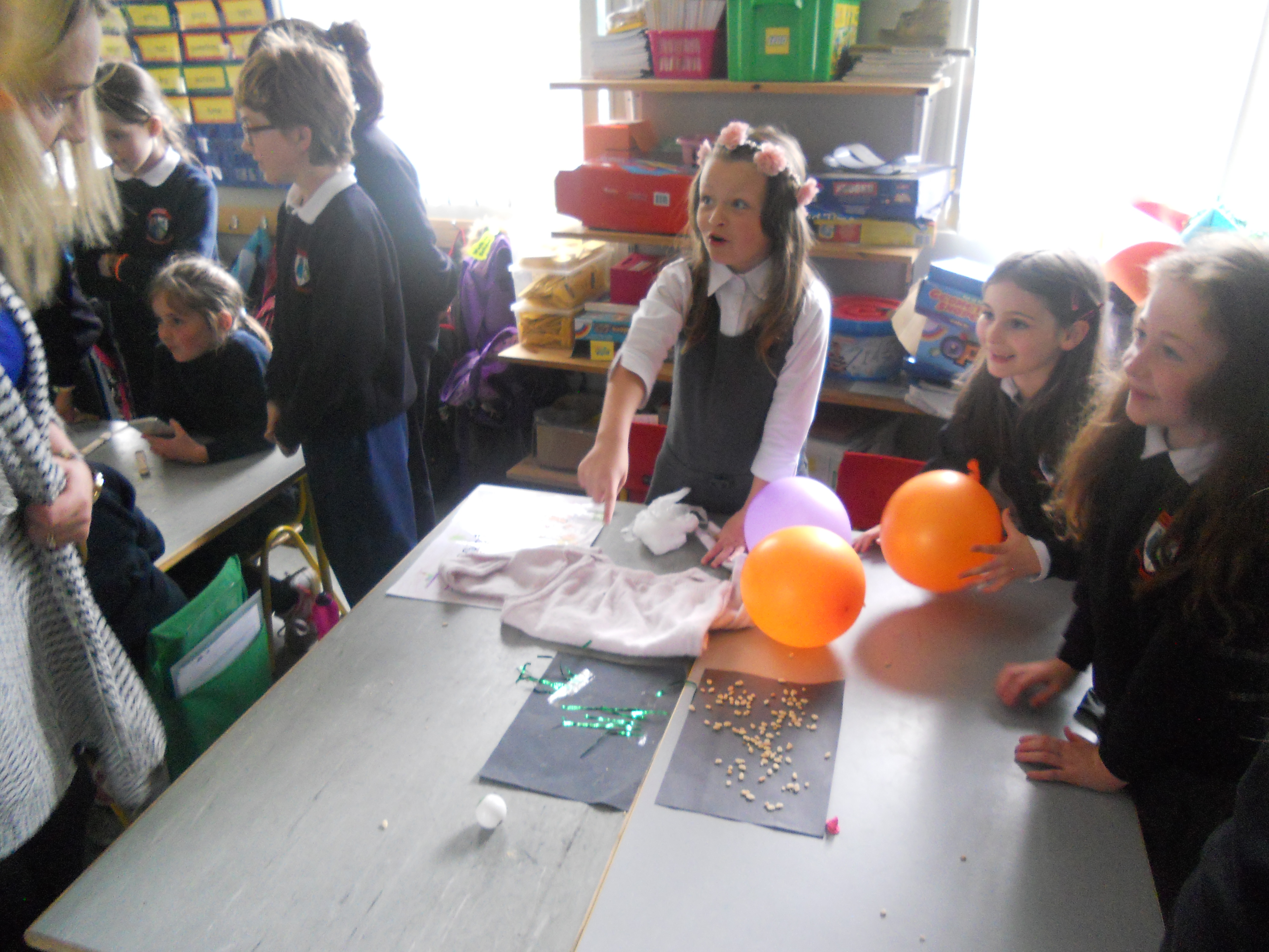 - Static electricity – We used some balloons to generate some static electricity by rubbing our hair and a wooly jumper. We checked to see how many rice krispies we could pick up with the balloons and also if we could move a ping pong ball across the table. We discovered that straight hair generates more static than curly hair.