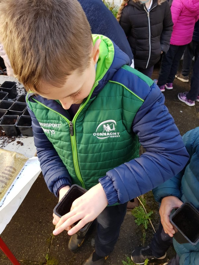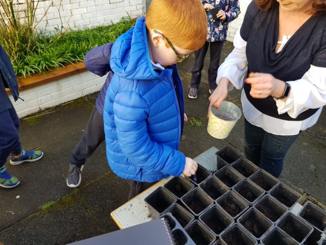 We were very lucky to have had a visit from Margaret in Dela restaurant. She spoke to a number of classes about how they grow the majority of the food that they use in their restaurant in their 100ft long polytunnel right here in our village. We planted a number of different seeds which she has kindly taken back to her polytunnel to get them started. When they are ready to plant out we will plant them in our school garden. We hope to harvest them before the end of the school term and make something delicious from it.