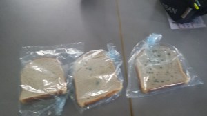 Senior infants explored the effects of washing their hands with an experiment. First they used a fresh piece of bread and put it into a bag. After they all handled a piece of bread and then put it in a bag and finally they washed their hands and handled another piece of bread. The results can be seen on the three pieces of bread.